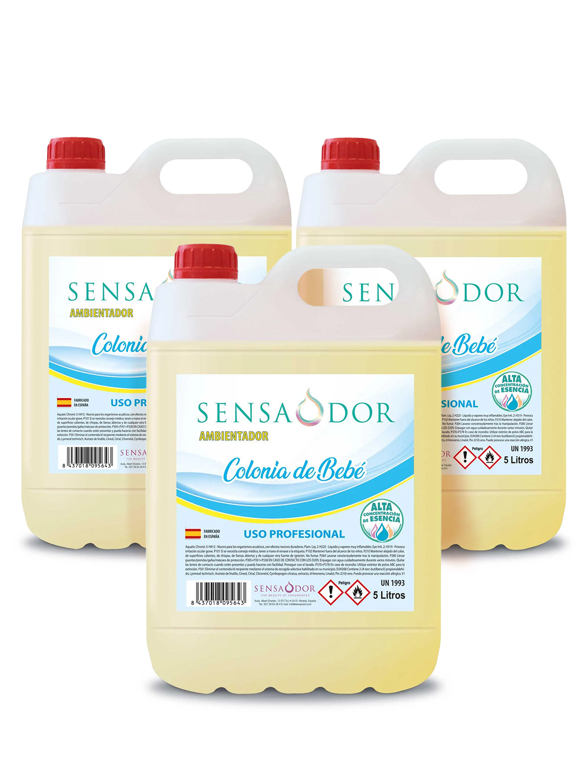 Ambientador de 5L de Sensaodor con olor a Colonia a Bebé se presenta en una garrafa para uso profesional o en el hogar. Apreciado por su olor muy fresco y ligero, esta fragancia despertará sentimientos y emociones de nuestra infancia, creando ambientes que favorecen la serenidad y el confort y la convierten en una de las más utilizadas por los consumidores.